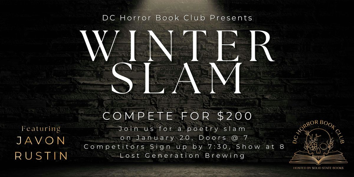 DC Horror Book Club presents our first poetry slam as a fundraiser for our scholarship program. All ticket sales for this event will be donated to DC Horror Book Club's events and scholarships sending horror writers of the DMV to a writing convention in Pittsburgh, PA (StokerCon 2026).