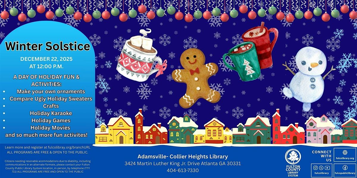 Welcome to the Winter Solstice event! Join us at the Adamsville-Collier Heights Library on December 22, 2025 at 12:00 PM for a magical celebration of the shortest day of the year. Let's embrace the cozy vibes, sip on hot cocoa, and enjoy the company of friends and family. Don't miss out on this special gathering to welcome the winter season. See you there!
