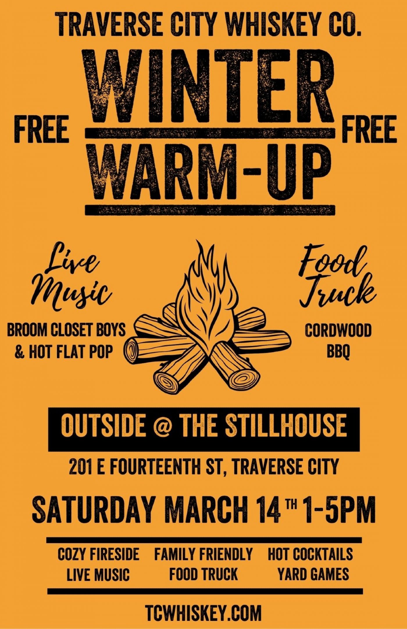 TC Whiskey Co. - The Stillhouse hosts the 3rd Annual Winter Warm-Up with music guests Broom Closet Boys and Hot Flat pop! Come enjoy cozy fires, live music, hot cocktails, yard games, and yummy food at this family friendly event!