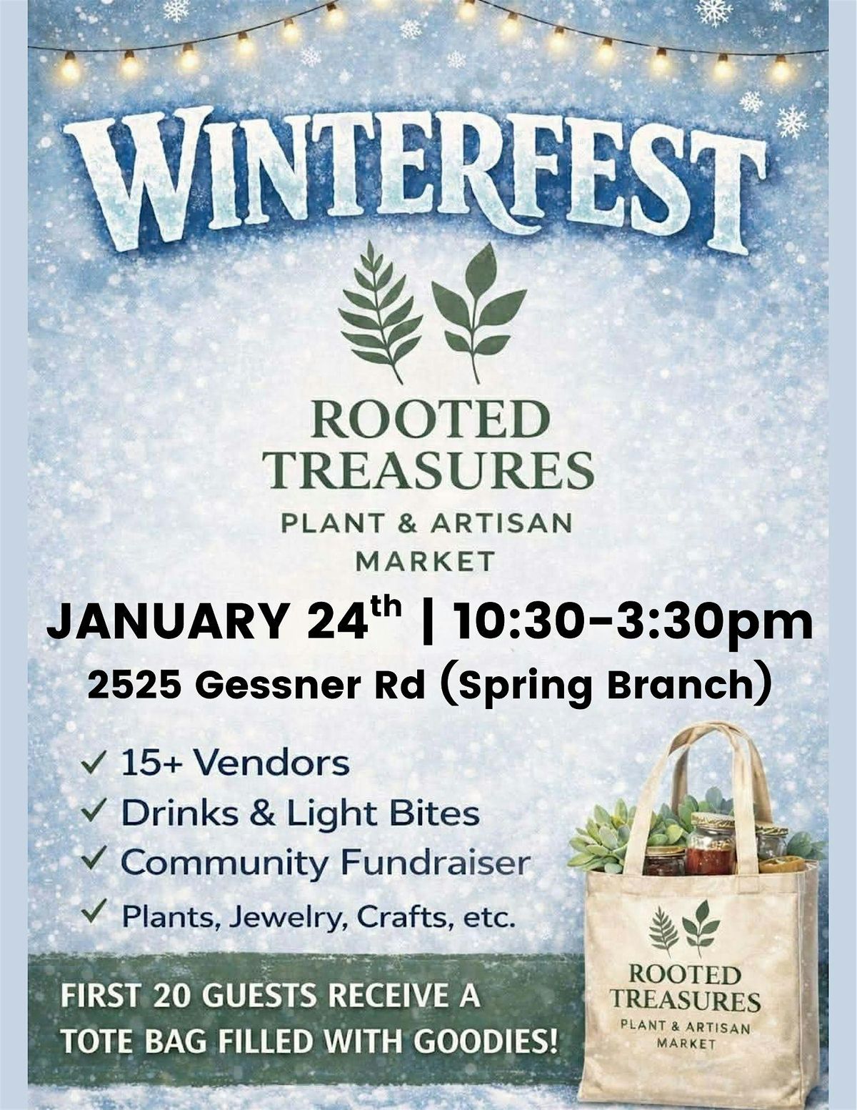 Winterfest at Rooted Treasures is a community-focused Plant & Artisan Market bringing together local vendors, handmade goods, and plant lovers in Spring Branch.