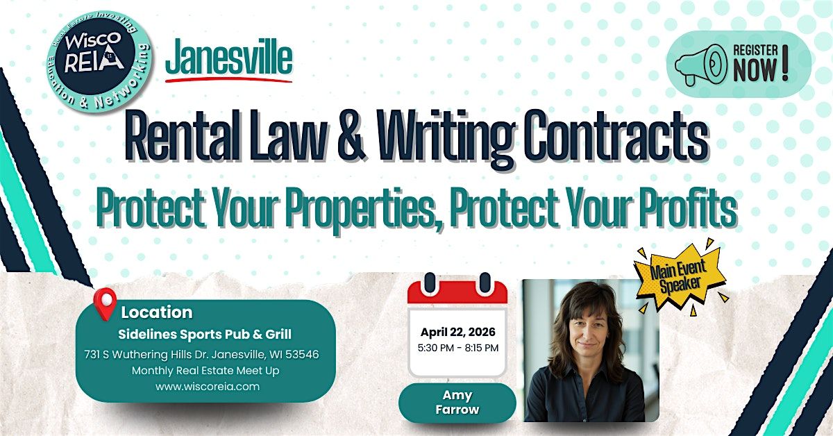 WiscoREIA Janesville’s Meeting Always Meets on the 4th Wednesday of the Month from 5:30 pm - 8:15 pm!