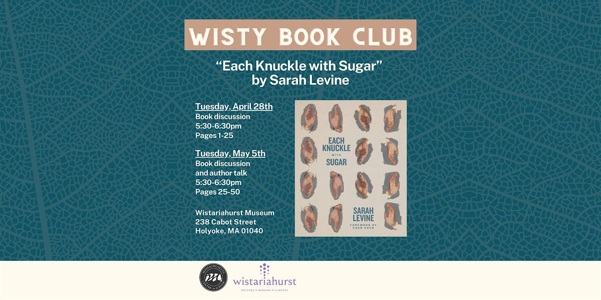 Join Wistariahurst Museum for our next book club book, culminating with an evening with poet Sarah Levine, whose collection "Each Knuckle with Sugar" received Poetry Honors in the Massachusetts Book Awards. This meeting will discuss pages 1-25 of the book.