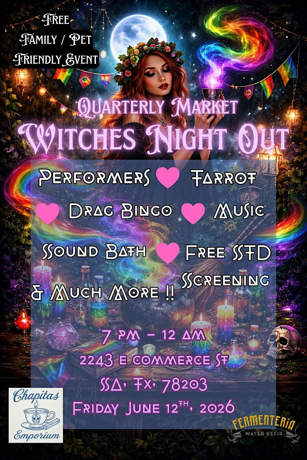 Join us for Witches Night Out: Pride Edition, brought to you by Chapitas Emporium! Celebrate your authentic self in a vibrant, inclusive space filled with mystical vibes and joyful energy. Explore tarot readings, shop unique finds from local vendors, and try your luck at lively drag bingo. Reset your spirit with a soothing sound bath, and take care of your health with free STD testing available on-site.