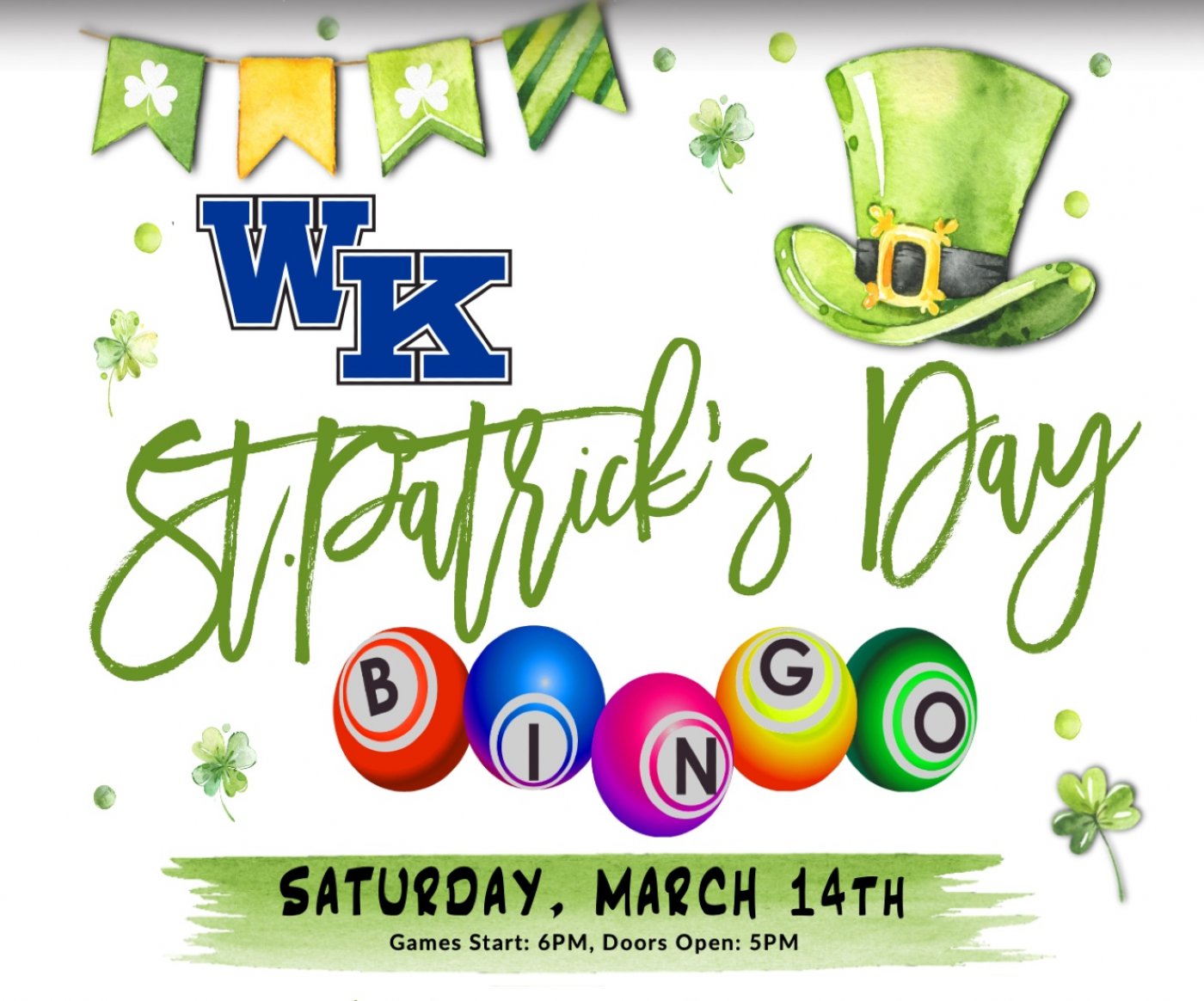 Join us for St. Patrick’s Day Bingo at Worthington Kilbourne High School on Saturday, March 14! Enjoy a festive night of bingo with cash prizes, basket raffles, a 50/50 drawing, pull tabs, great food, and sweet treats — all while supporting the Kilbourne Bands. Doors open at 5 PM and games start at 6 PM. Grab your green and your lucky crew for a fun-filled evening in the WKHS Main Gym! 🍀