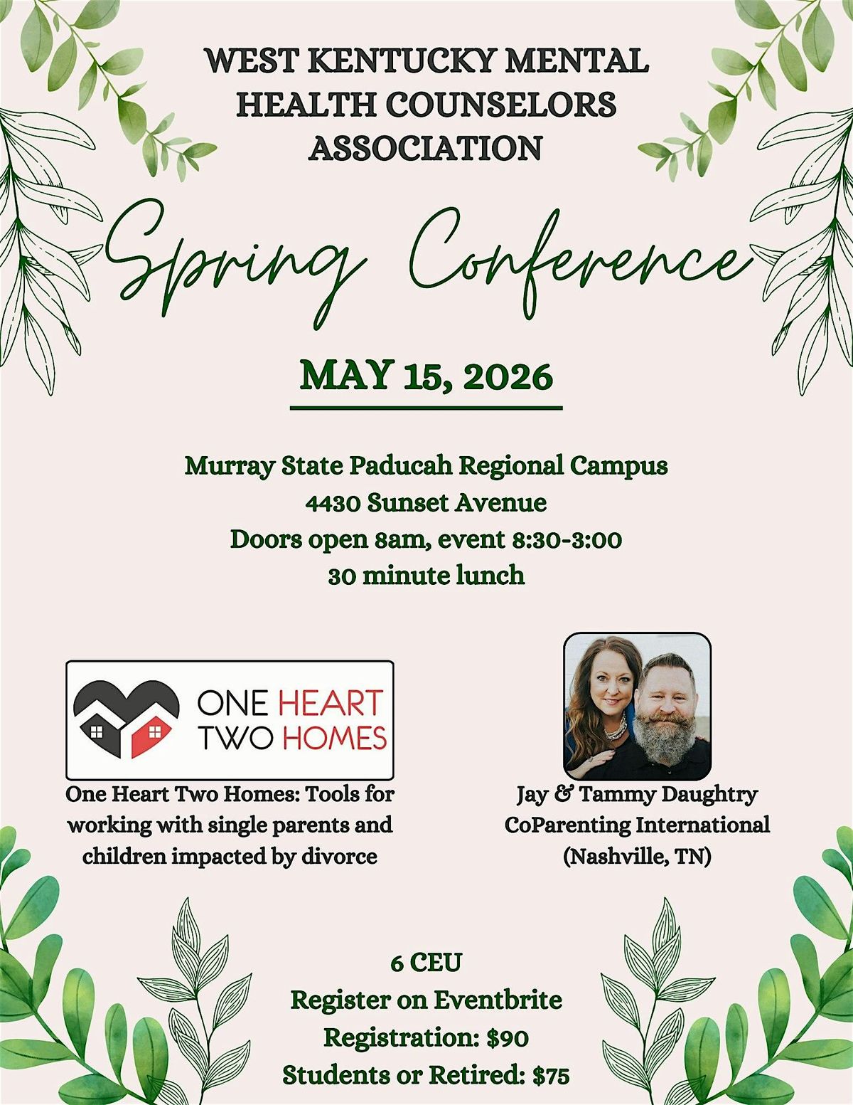 Mental health professionals: Join us for a one-day conference. We are pleased to have Jay and Tammy Daughtry with Coparenting International (Nashville, TN) with us. Prepare for a day packed with helpful information for all mental health professionals working with families, children, and coparents. This day training will provide 6 CEUs which are pre-approved for LPCs, and can be presented to other boards and disciplines. Lunch provided by Artisan Kitchen.