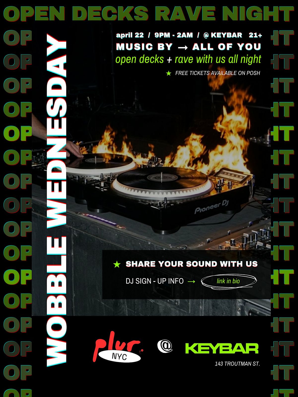 join the plur.nyc fam wednesday 4.22 at keybar for the first of our wobble wednesdays series :)