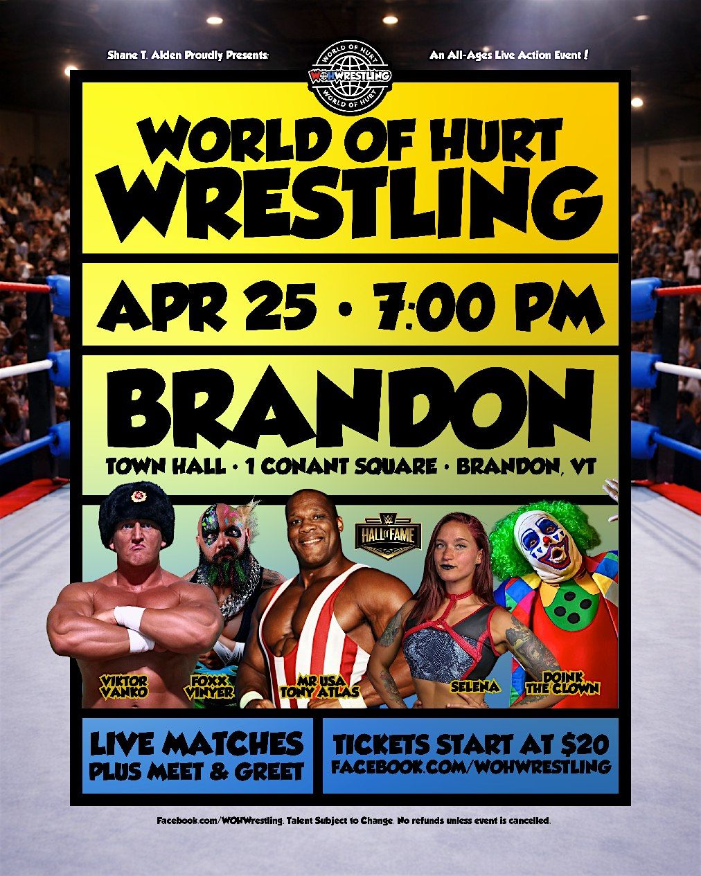 Get ready for an exciting night at the Brandon Town Hall on April 25, 2026 at 7:00 PM (Eastern Time)! Don’t miss out as WOH WRESTLING brings the action live with special appearances by WWE guest stars. It’s the perfect chance to see your favorite wrestlers up close in a fun, electric atmosphere. Grab your friends and come join the fun in Brandon, VT!