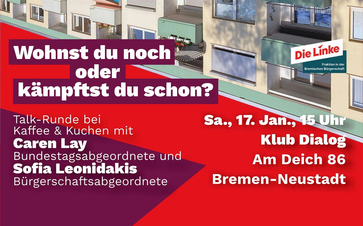 In einer gemeinsam Diskussion werden die Mieten- und Wohnexpert*innen Sofia Leonidakis und Caren Lay sowie der Mietrechtsanwalt Enno Hinz u.a. diesen Fragen nachgehen und aufzeigen, wie Politik und Zivilgesellschaft gemeinsam gegen zu hohe Mieten und für bezahlbaren Wohnraum kämpfen können - von der Einführung einer Mietwucherstelle, dem gemeinnützigem Wohnungsbau, der Rekommunalisierung bzw. Vergesellschaftung bis hin zu Mietkampagnen durch Mieter*innen und Aktive. Teilnehmen wird an der Diskussion auch ein Mieter aus dem Rembertihochhaus, der seine persönlichen Erfahrungen im Kampf gegen Mietwucher teilen wird.