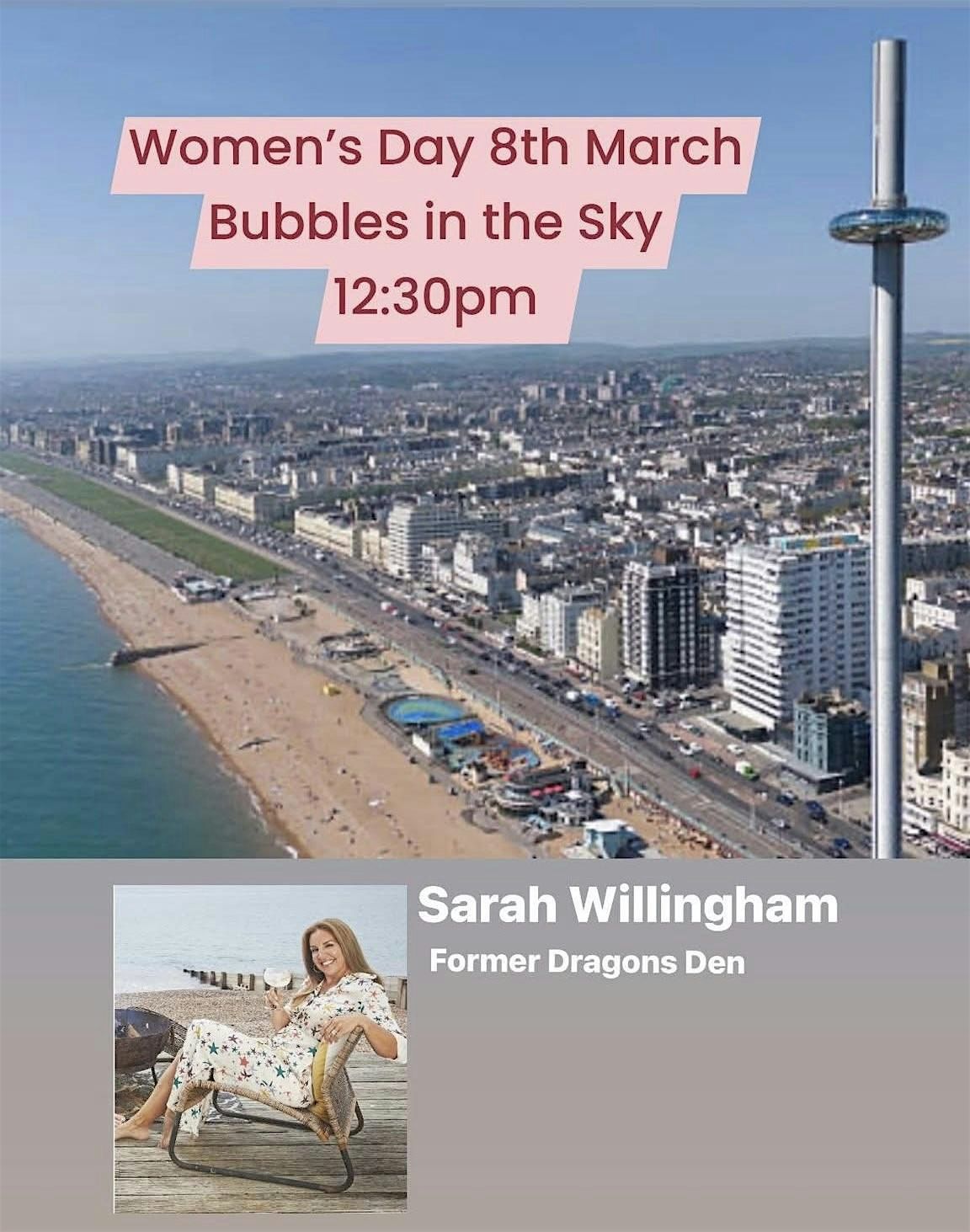 Join me at 450m high in person for an unforgettable Women’s Day celebration on the SUNDAY 8th! Soar high and feel the energy as we celebrate strength, courage, and joy together with a vibrant Dragons Den vibe. It's all about empowering moments, laughter, and making memories under the open sky. Don’t miss out on this unique experience and the chance to listen to Sarah Willingham whilst enjoying Brighton