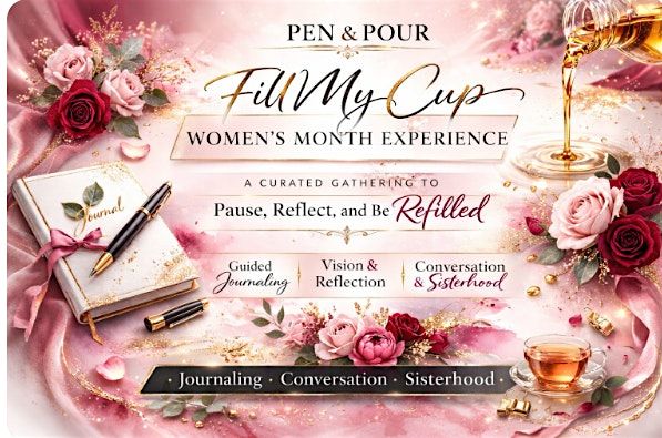 Pen & Pour is an immersive afternoon of guided journaling based on psalm 23:5, vision reflection, meaningful conversation, encouragement, and shared refreshments. Each guest receives a copy of the Pen & Pour – Fill My Cup Journal as we create space to pour out honestly and be renewed in spirit, clarity, and purpose.