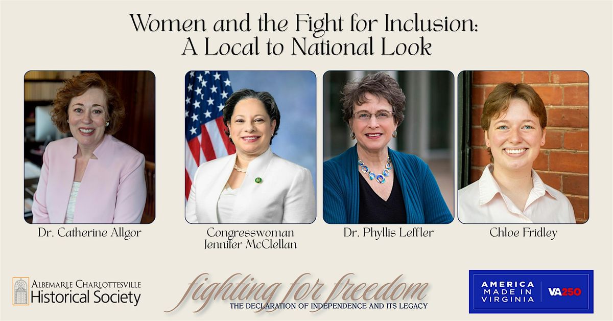 Joining the panel will be Virginia District 4 Congresswoman Jennifer McClellan, Professor Emerita from the University of Virginia History Department Phyllis Leffler, and Director of Education at the Ivy Creek Foundation Chloe Fridley, who will all discuss ways that women's fight for inclusion has shaped our local history and informs our national future. The discussion will be moderated by Catherine Allgor, President Emerita of the Massachusetts Historical Society