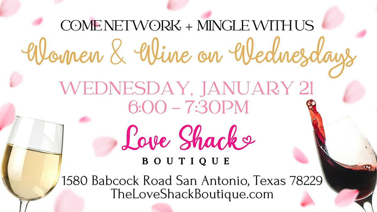 San Antonio's "Women and Wine on Wednesdays" - a women's professional and social networking group - will gather for our 1st meet-up of 2026 on Wednesday, January 21 6PM-7:30PM at : Love Shack Boutique · Love Shack Boutique Event Center 1580 Babcock Road, San Antonio, Texas 78229