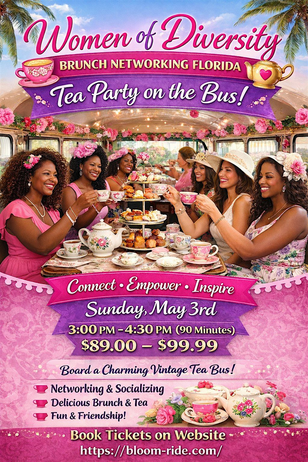 Step aboard a beautifully styled vintage tea bus for a unique 90-minute brunch networking experience. Enjoy a curated selection of teas and delicious sweet and savory bites while taking in a relaxing scenic ride.
