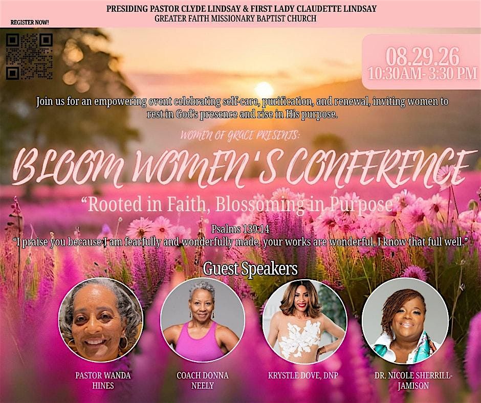 Bloom Conference exists to cultivate women who are deeply rooted in faith and boldly blossoming in purpose. Grounded in the truth of Psalm 139:14, we celebrate that every woman is fearfully and wonderfully made intentionally planted by God, formed with vision, and called to flourish.