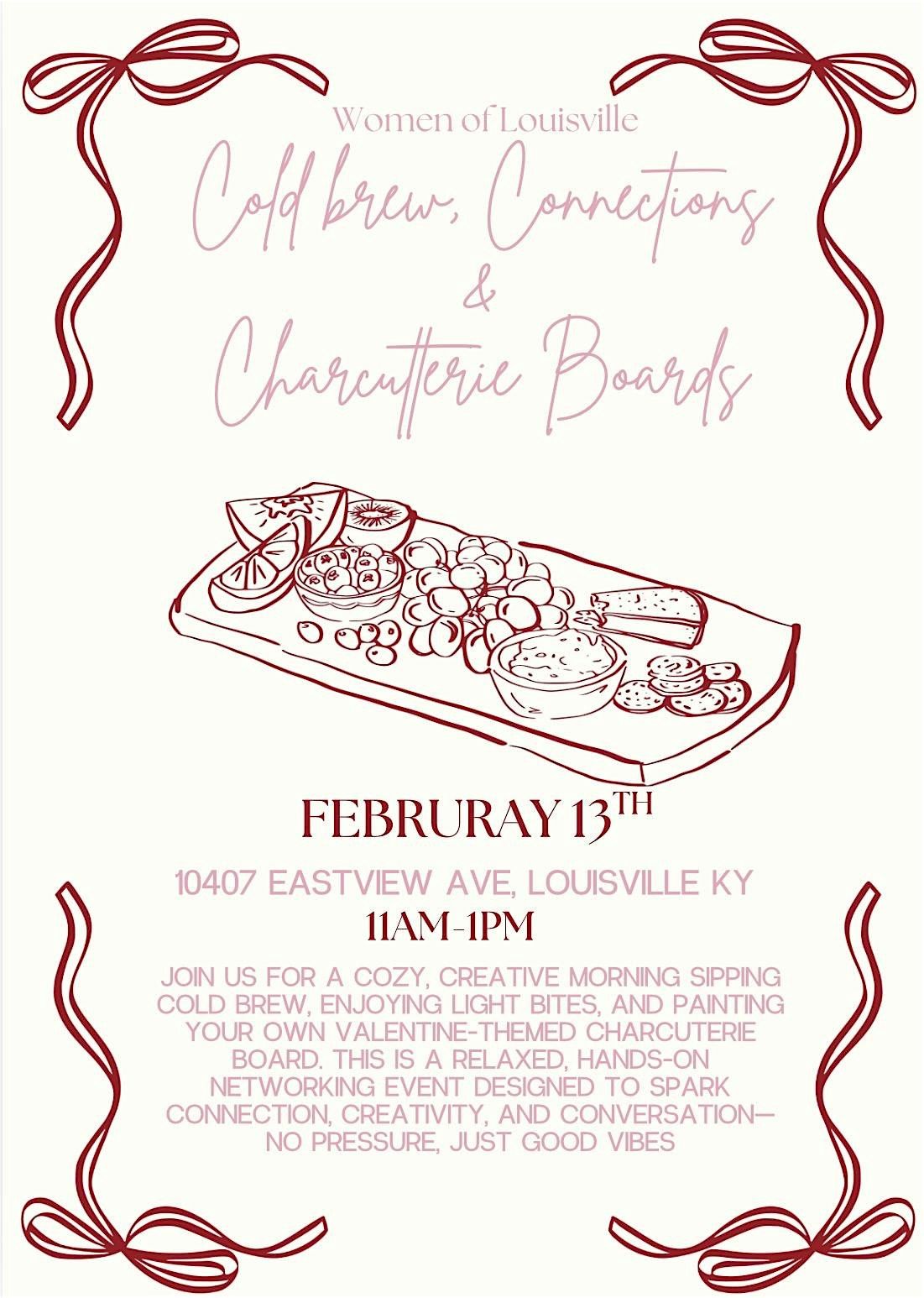 Join Women of Louisville for Cold Brew, Connections & Charcuterie Boards—a cozy morning of sipping cold brew, enjoying light bites, and painting your own Valentine-themed wood charcuterie board to take home.