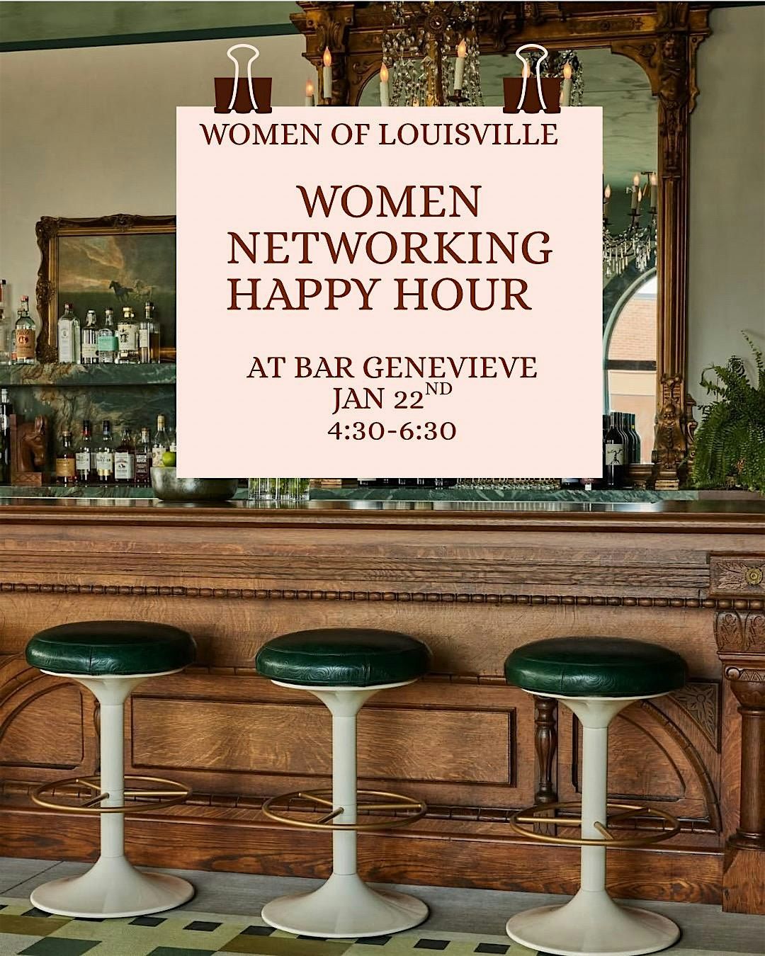 This is a FREE event (cocktails cost extra lol 🍸) but come meet some truly amazing women in our city, make new connections, and enjoy a cocktail or mocktail at the gorgeous Bar Genevieve.