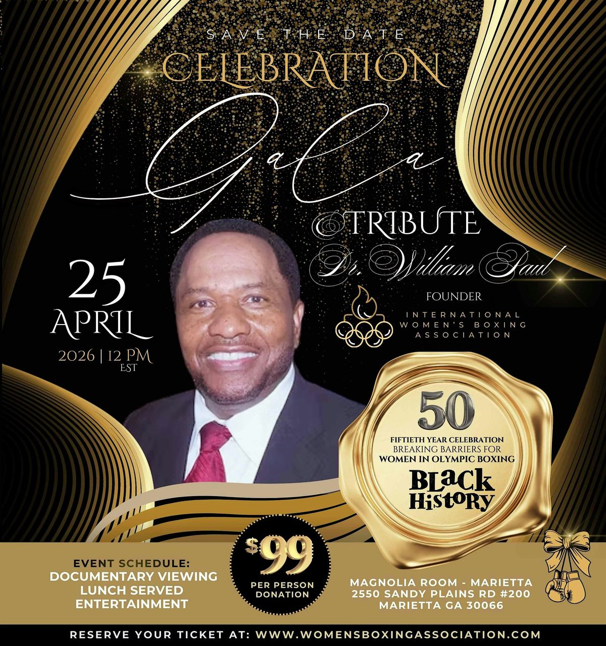 Get ready for an unforgettable day. Join us in person for the Women's Boxing Celebration Gala, where we honor the passion and power of Dr. William Paul, a true African-American living legend. See you there!