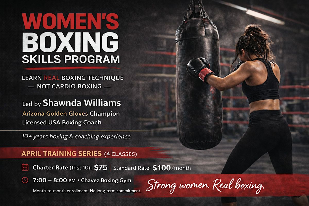 This class is led by Shawnda Williams, an Arizona Golden Gloves Champion and licensed USA Boxing coach with over a decade of boxing and coaching experience.