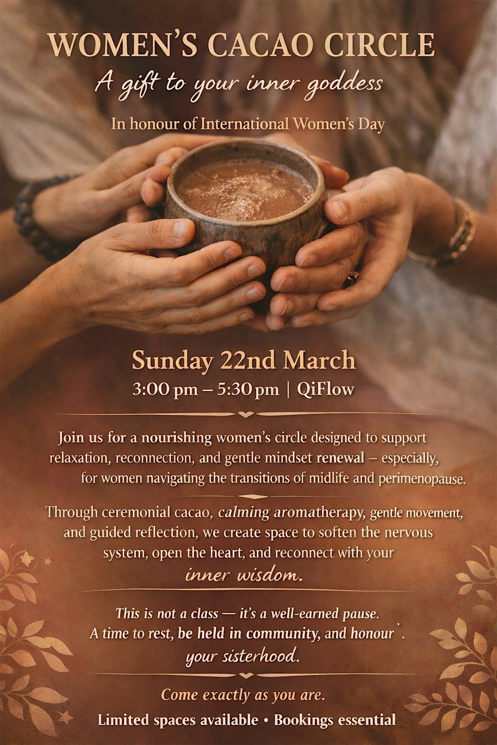 In honour of International Women's Day, we gather in circle to pause, soften, and return to ourselves. This women’s cacao and yoga ceremony is an invitation to step out of the noise of daily life and into a space of presence, connection, and embodied wisdom.