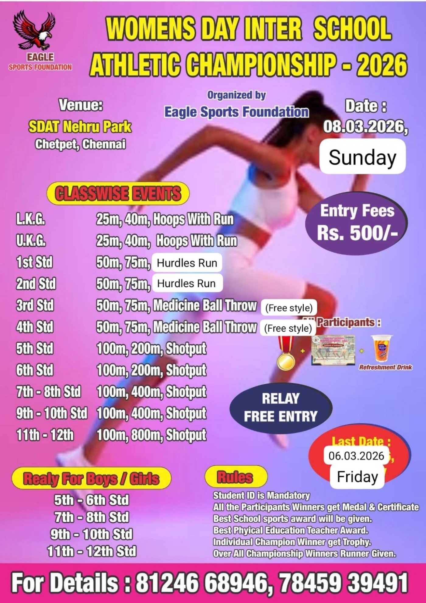 Women's Day Inter School Athletic Championship Mar 2026 organised by Eagle Sports Foundation on 8th Jan 2026 at SDAT Nehru Park, Chetpet, Chennai.