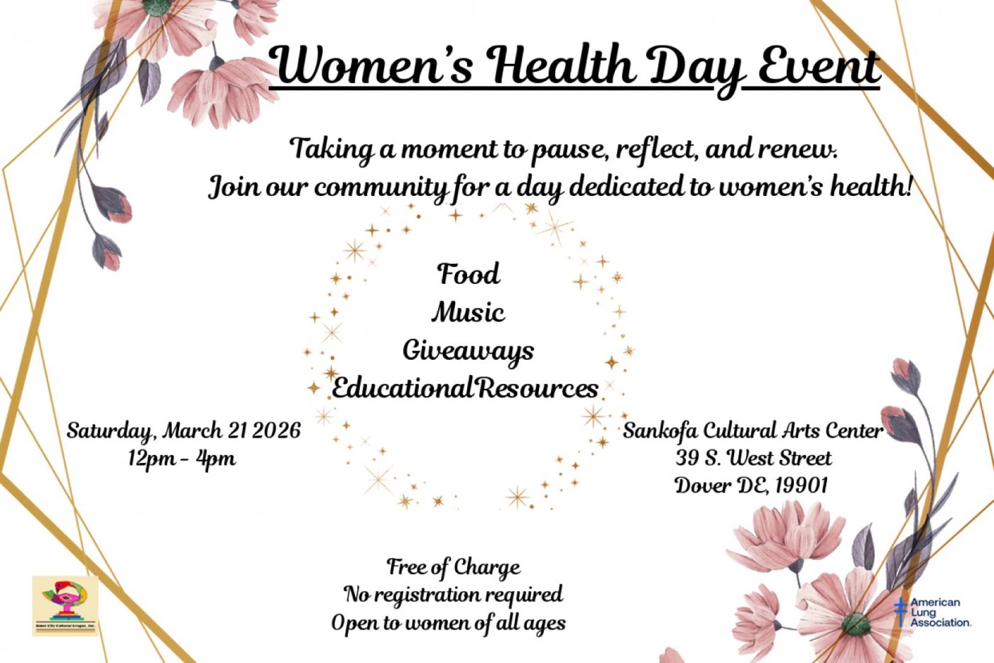 Come join the Inner City Cultural League for a day dedicated to the health and wellness of women in our communities. The event will take place at the Sankofa Cultural Arts Center at 39 S. West Street. All women of all ages are welcome for a day full of food, music, and giveaways. 12pm-4pm