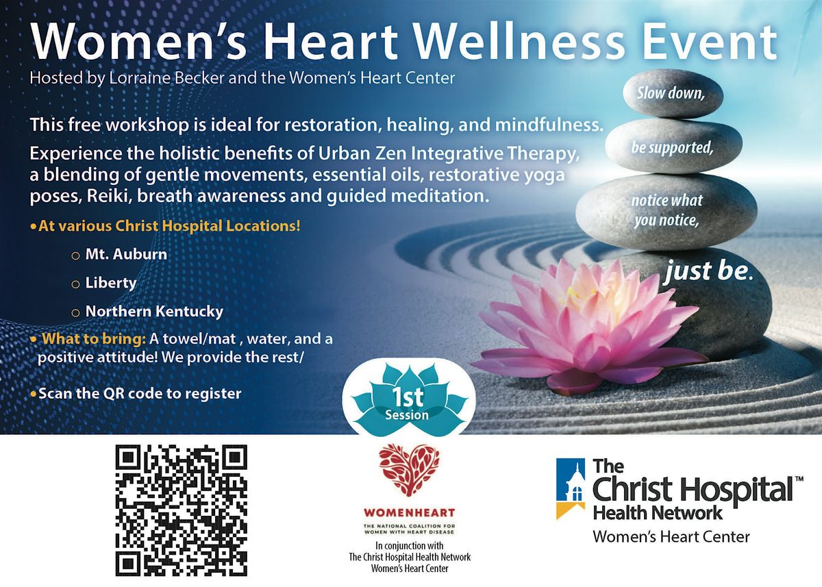 Women's Heart Wellness Practice – This FREE, in-person, and recurring workshop is hosted by Lorraine Becker and The Christ Hospital Women's Heart Center (TCH-WHC). It is intended for female adult TCH-WHC patients who are 18+, as well as adult caregivers/loved ones supporting WHC patients, or other female adult TCH Heart and Vascular patients. The purpose of the workshop is to learn and practice integrative therapies that incorporate gentle healing modalities such as guided meditation, breath awareness, restorative yoga poses, Reiki, and essential oil therapy to supplement traditional medical therapy to better manage pain, anxiety, and/or medical trauma. It is ideal for restoration, healing, and mindfulness. Come and experience the holistic benefits of Urban Zen Integrative Therapy.