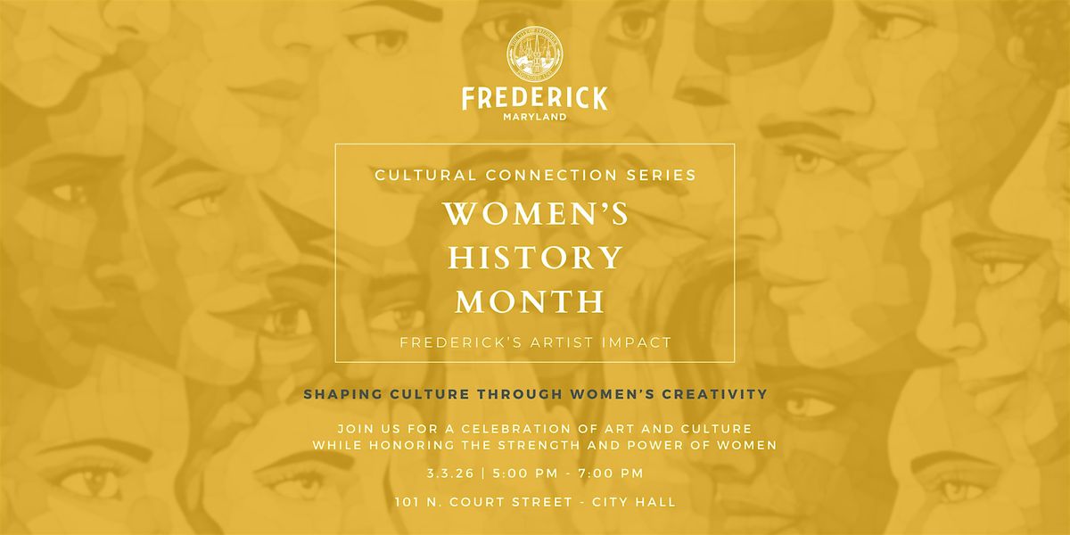 Join us Tuesday, March 3, 2026, from 5:00 p.m. to 7:00 p.m. at City Hall (101 N. Court Street) for an inspiring evening celebrating creativity, expression, and the power of women in the arts. This vibrant event brings history and culture to life while honoring the past, celebrating the present, and inspiring the future. Experience the impact of women artists in Frederick through live art, performances, interactive experiences, and gallery exhibition.