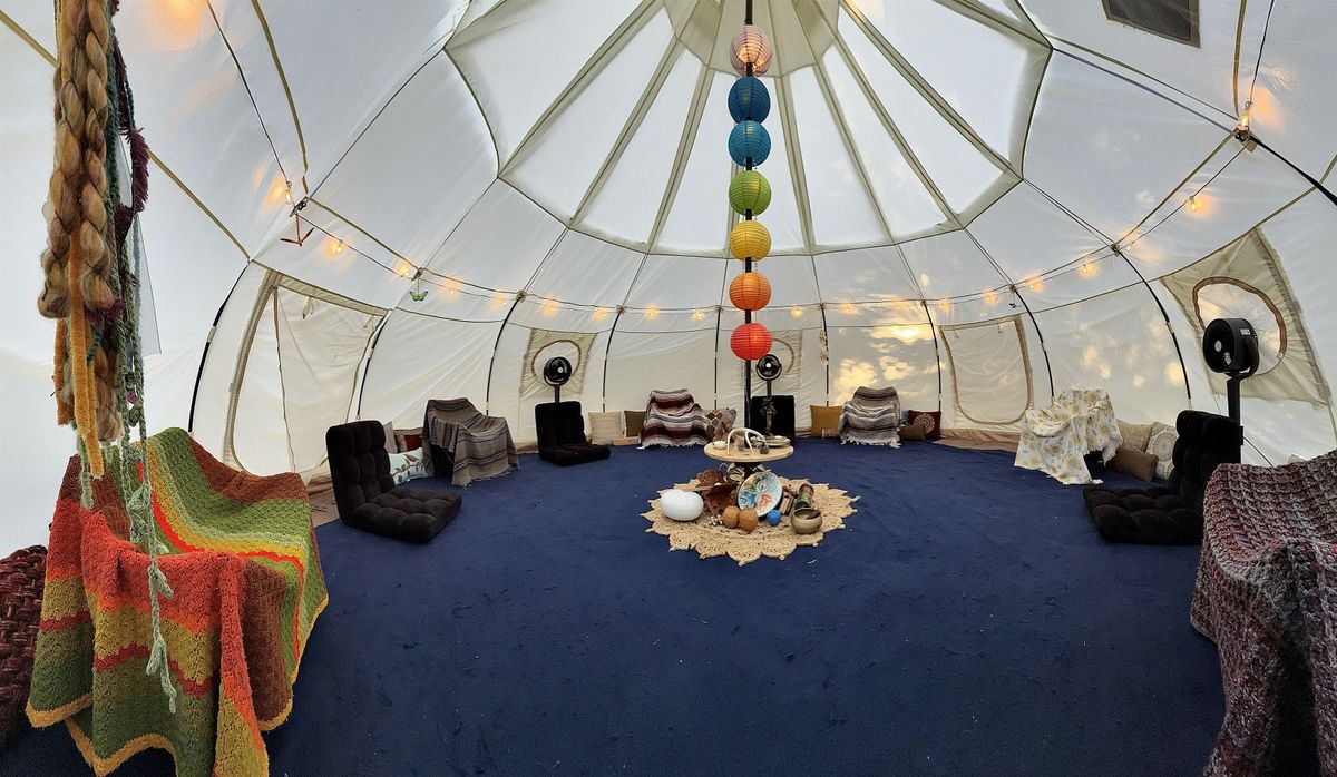 We have 6 regular chairs, 4 floor chairs with backs, and pillows to sit on. Participants who cannot sit on the floor will line up first to enter the Unity Dome when it is time. If get more than 6 people who need chairs, then I will provide more. Please let us know when you arrive.