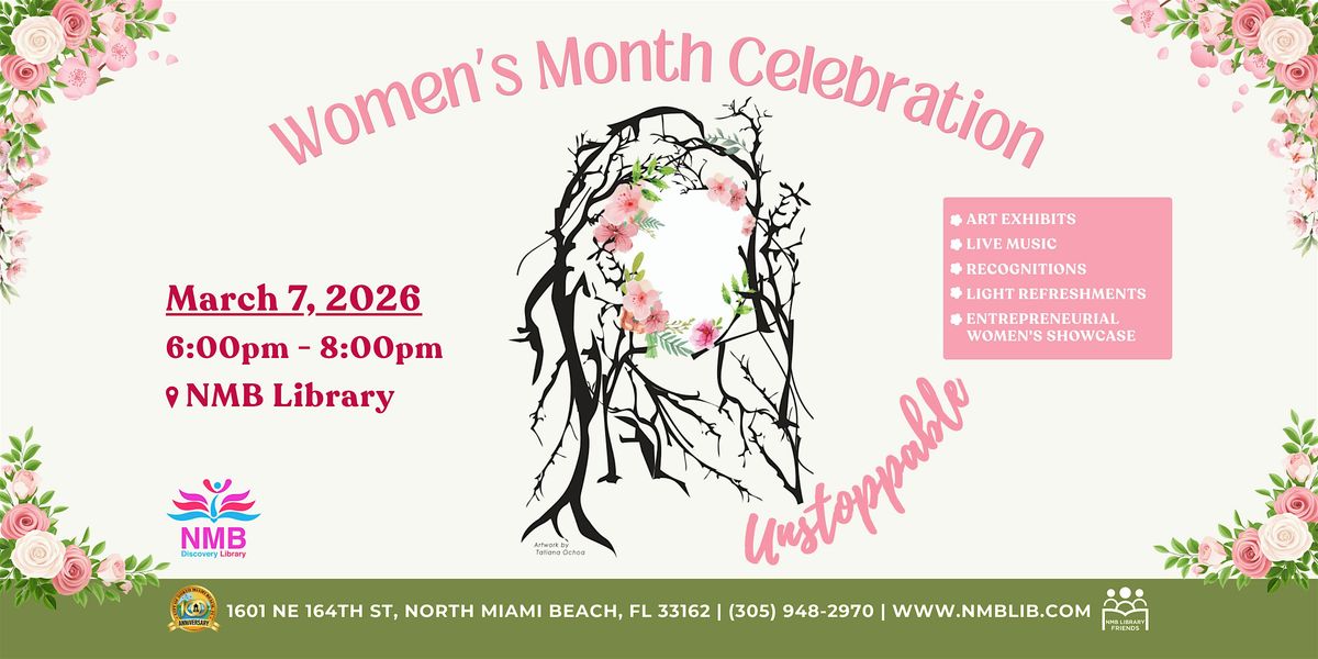 Celebrate Women’s Month with an inspiring afternoon at the North Miami Beach Library. Enjoy art exhibits from talented local women artists, live music, light refreshments, and meaningful moments honoring remarkable women in our community and beyond. Bring friends and family and make it a memorable celebration together!