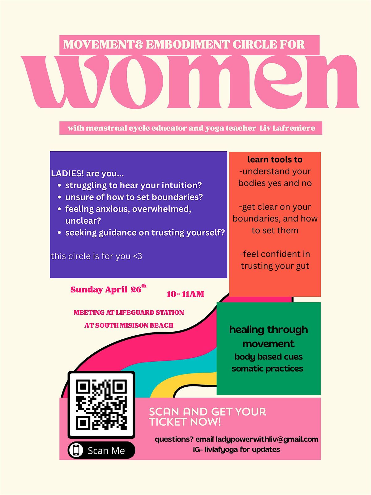We will meet at lifeguard station, then walk together on the beach to find our spot! We will discuss boundaries, how our bodies respond, what yes and no feel like emotionally and physically . We will practice somatic tools to listen to our intuition, our body, and honor our boundaries.
