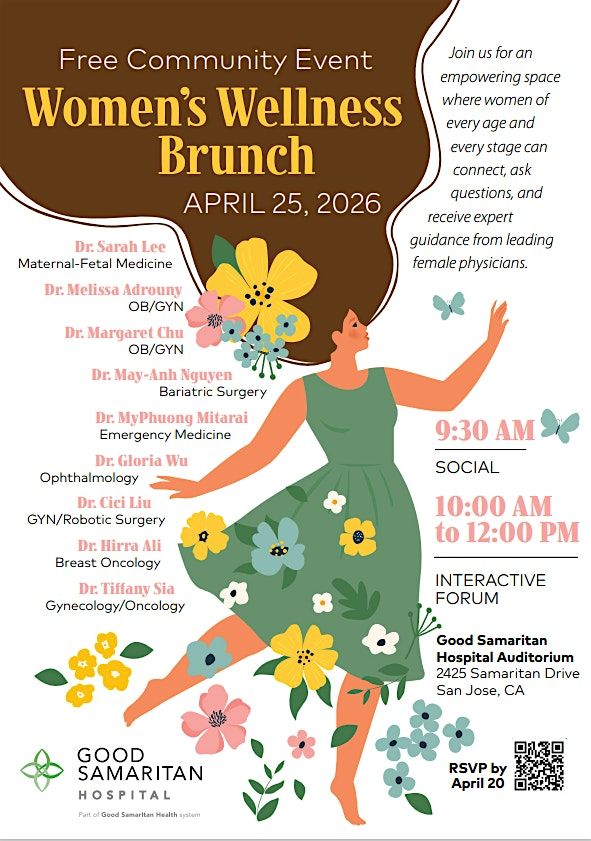 Join us for a free Women’s Wellness Brunch on April 25, 2026, at Good Samaritan Hospital in San Jose. This empowering event brings together women of all ages for a morning of connection, expert guidance, and meaningful conversation. Attendees will hear from leading female physicians across a range of specialties during an interactive forum designed to answer questions and support women’s health at every stage of life. The event begins with a social at 9:30 AM, followed by the program from 10:00 AM to 12:00 PM. RSVP by April 20 to reserve your spot.