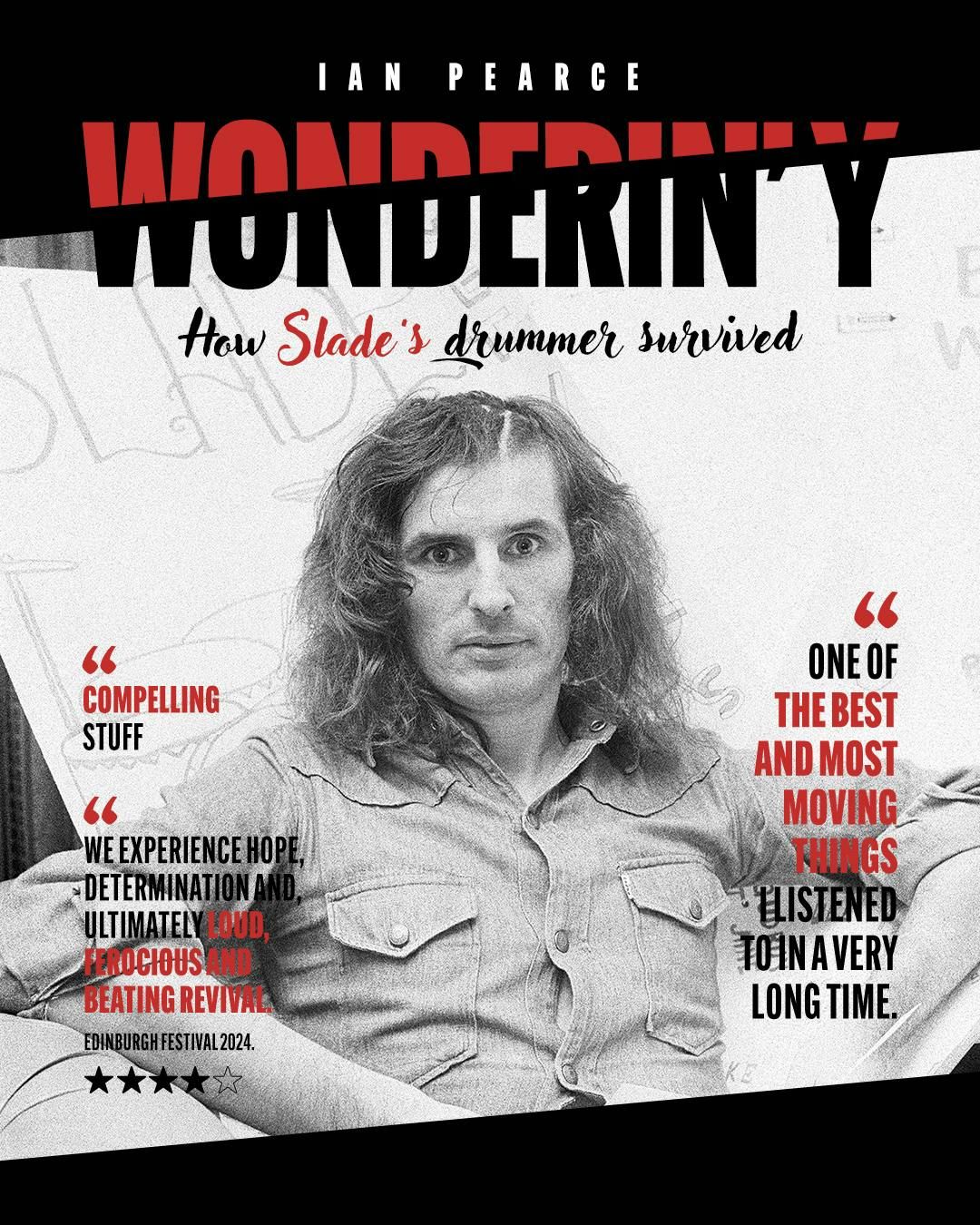 In the summer of 1973 at the height of his fame, Slade’s drummer Don Powell was involved in a devastating car accident, leaving him with brain injury that resulted in severe and lasting memory loss. Award winning writer and performer Ian Pearce collaborated with Don to recreate the emotional journey to recovery in this gripping and emotional one man show.