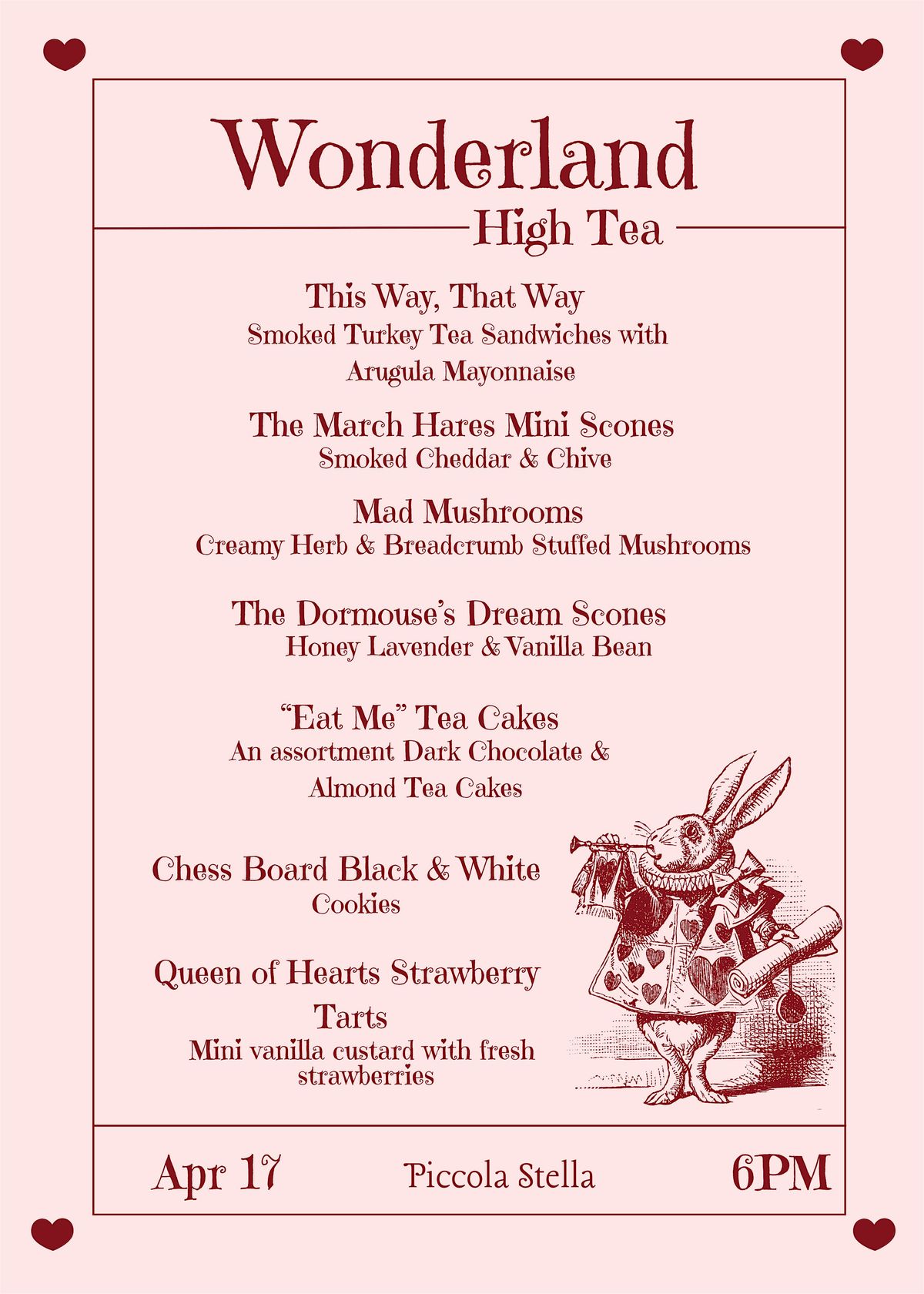 Whimsical high tea inspired by Wonderland—savory bites, curious sweets, and a most merry unbirthday spirit.