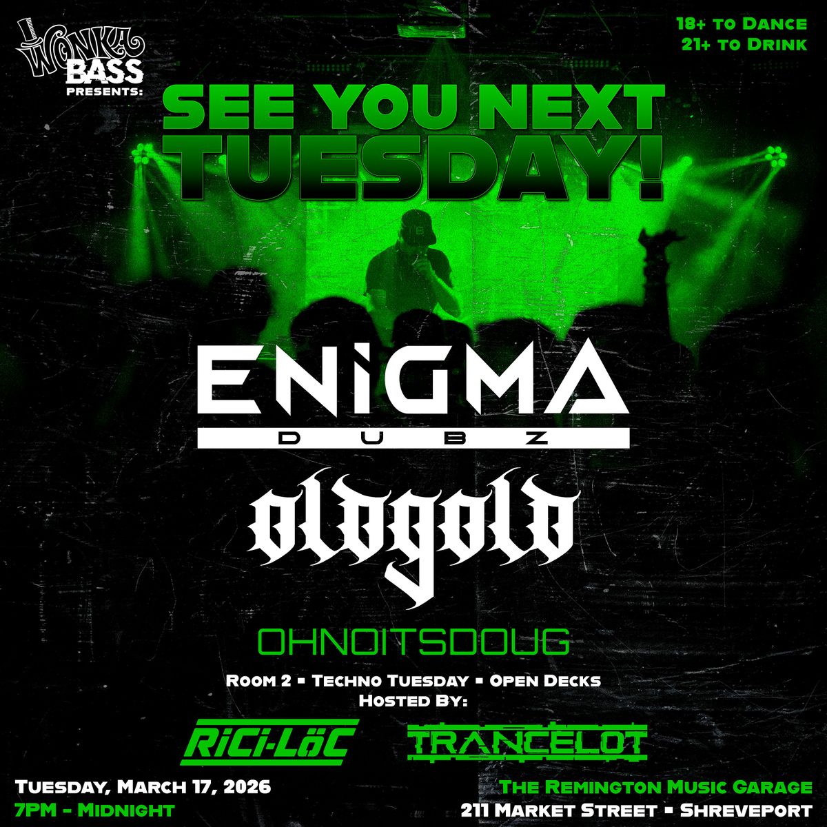WONKA BASS returns to The Remington Music Garage for a TWO ROOM special St. Patrick's Day Pop Up Bass Session, bringing deep dubstep, heavy 140 and underground bass music to downtown Shreveport.