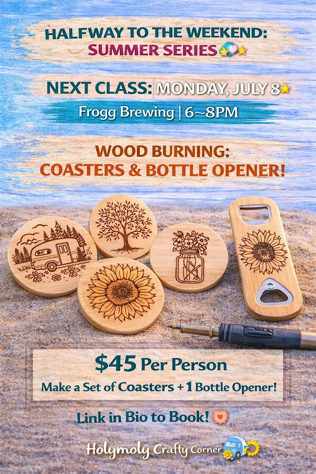 We’re wood burning your own custom set of coasters + 1 bottle opener — yes, you’re leaving with a FULL set 👀
