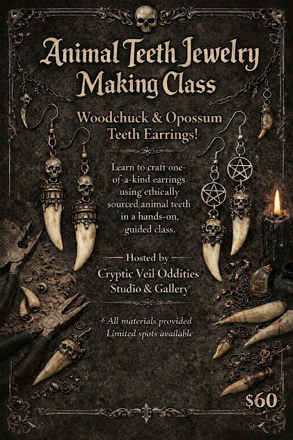Create unique jewelry inspired by woodchuck and opossum teeth. All supplies will be provided and you will take home what you make!About this Event