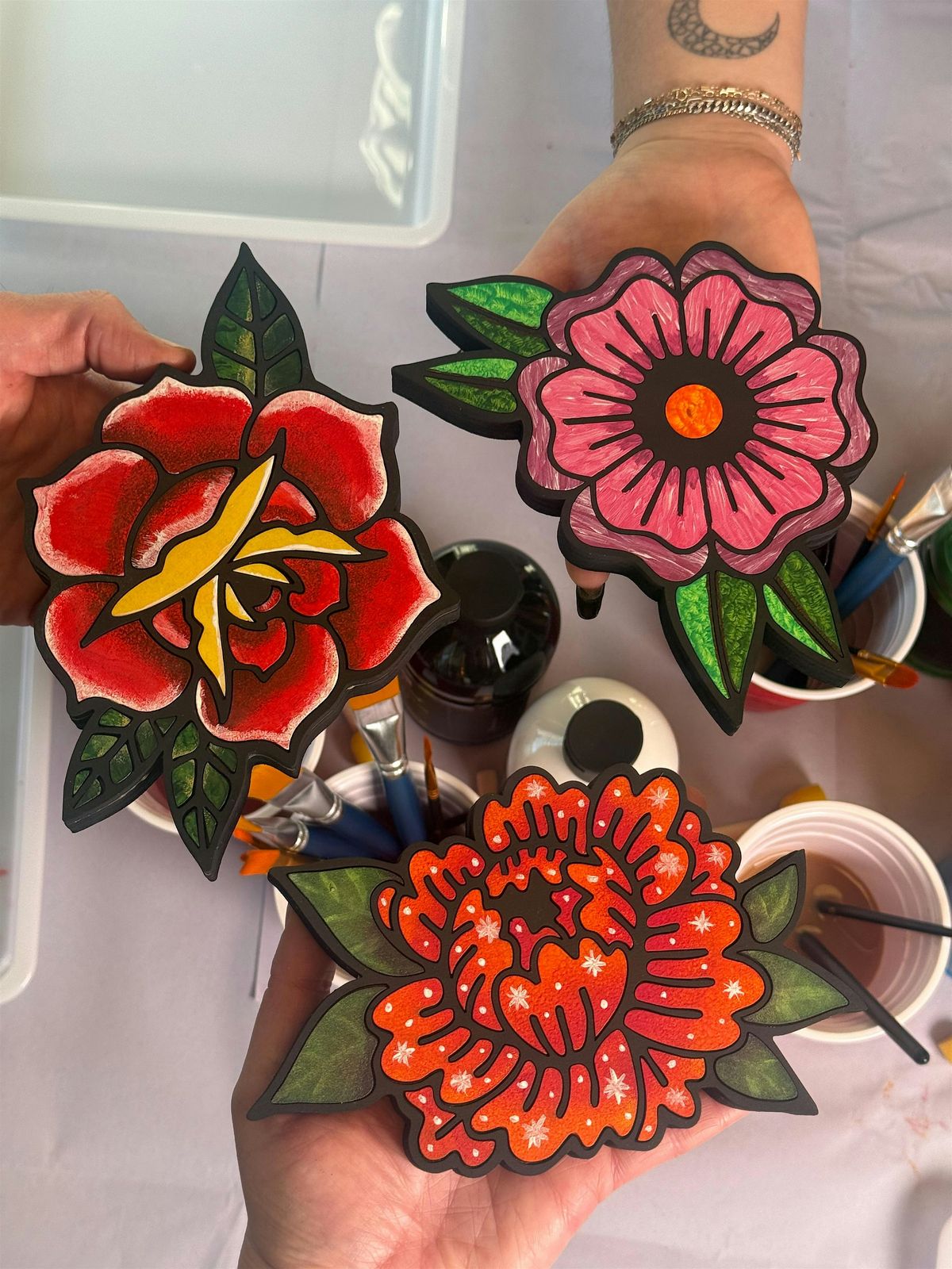 In this guided workshop, attendees will hand-paint and assemble their own wooden flower wall hanging, inspired by traditional tattoo artwork.