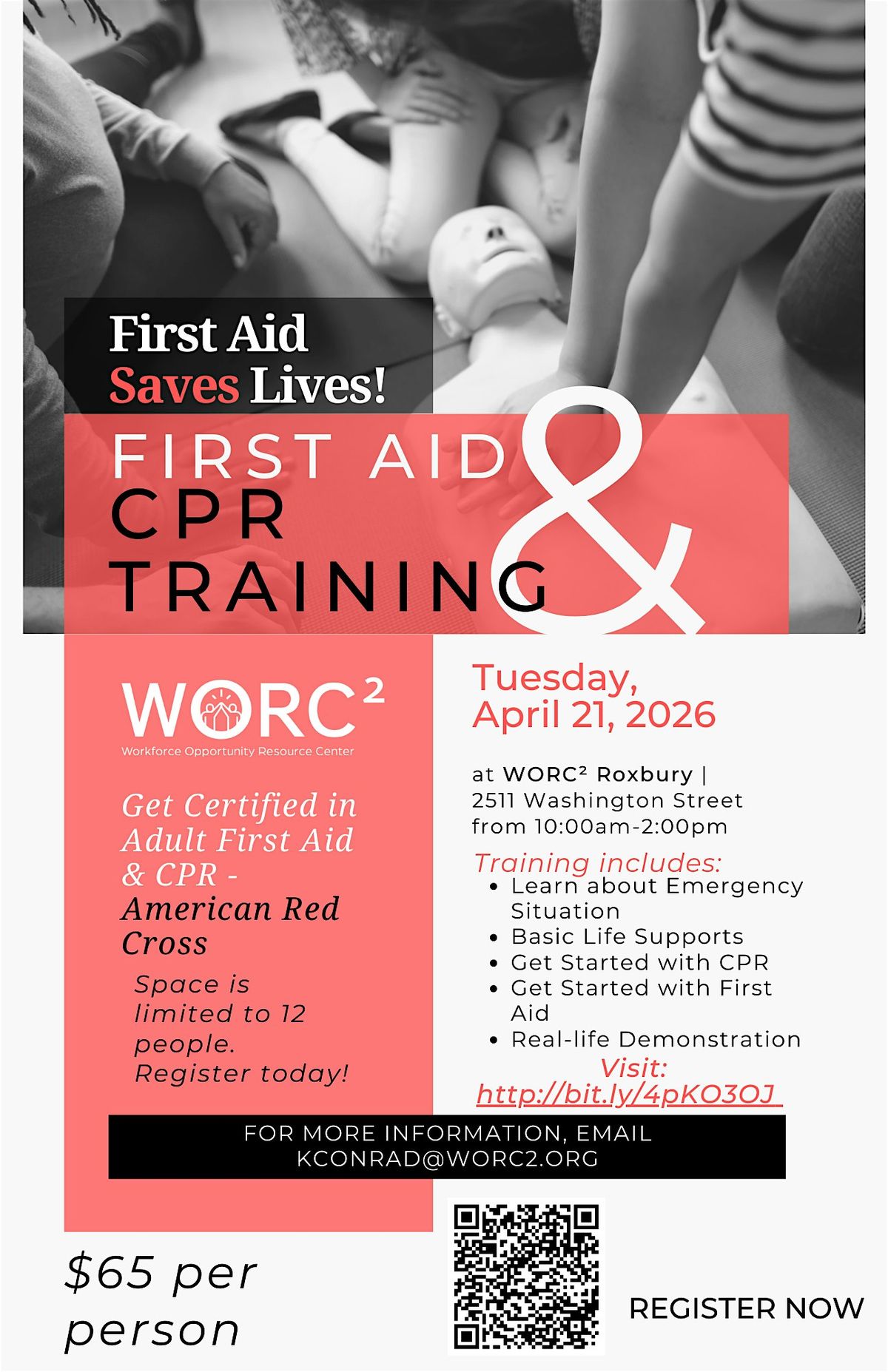 Welcome to WORC²! Join us for our upcoming event: First Aid & CPR Training. Learn life-saving skills on April 21st at 10:00 am at our Roxbury location. Be prepared to handle emergencies with confidence. See you there!
