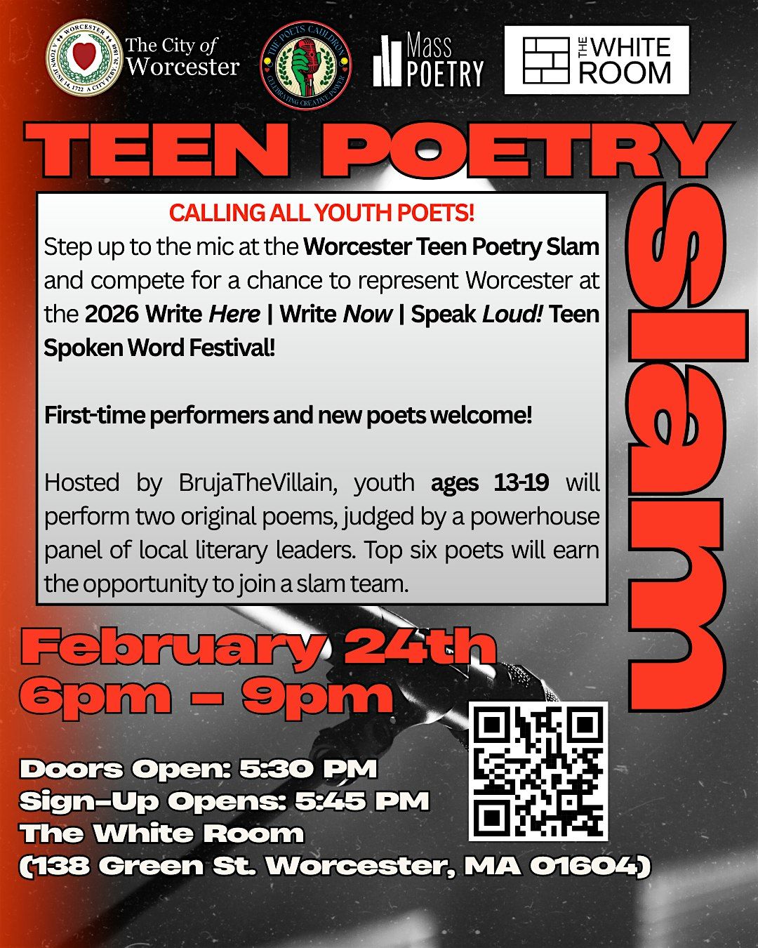 Step up to the mic at the Worcester Teen Poetry Slam and compete for a chance to represent Worcester at the 2026 Write Here | Write Now | Speak Loud! Teen Spoken Word Festival!