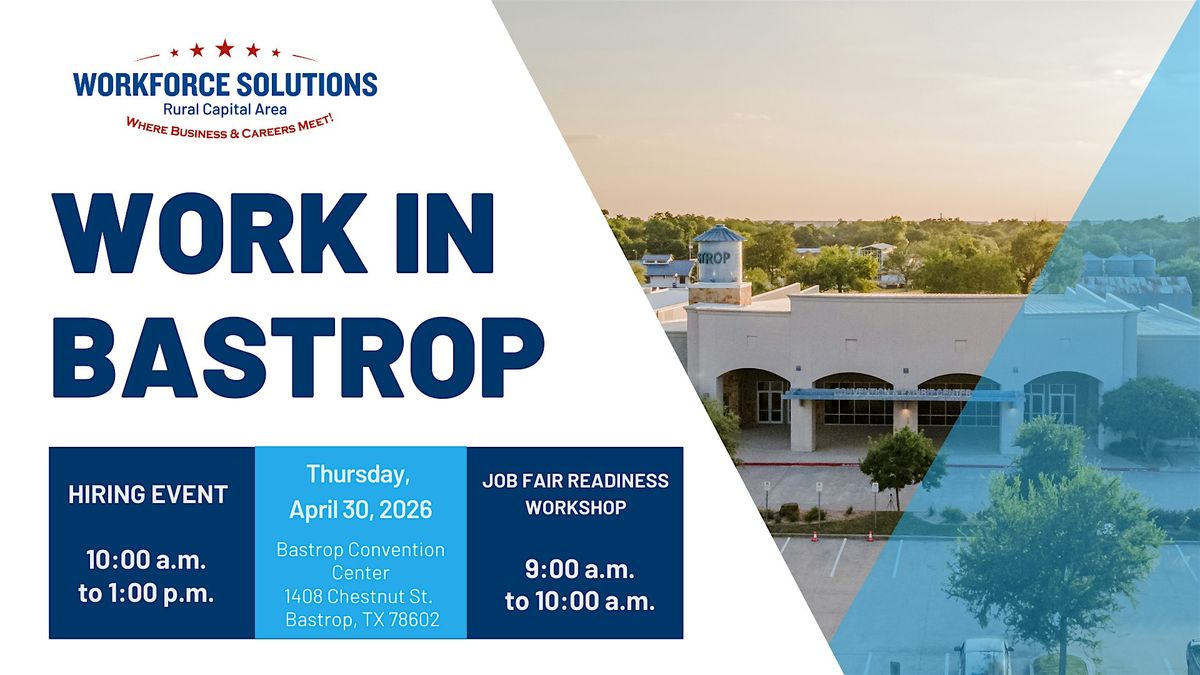 Join Workforce Solutions Rural Capital Area and our community partners for the Work in Bastrop Hiring Event on Thursday, April 30, 2026, at the Bastrop Convention Center.