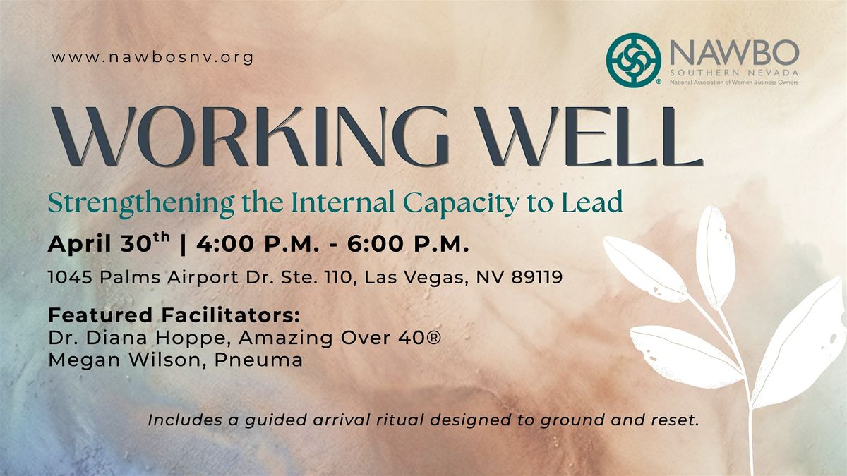 Join NAWBO Southern Nevada for the launch of Working Well, a 4-part leadership series designed to strengthen the internal conditions that support effective leadership: clarity, energy, emotional regulation, and purpose.