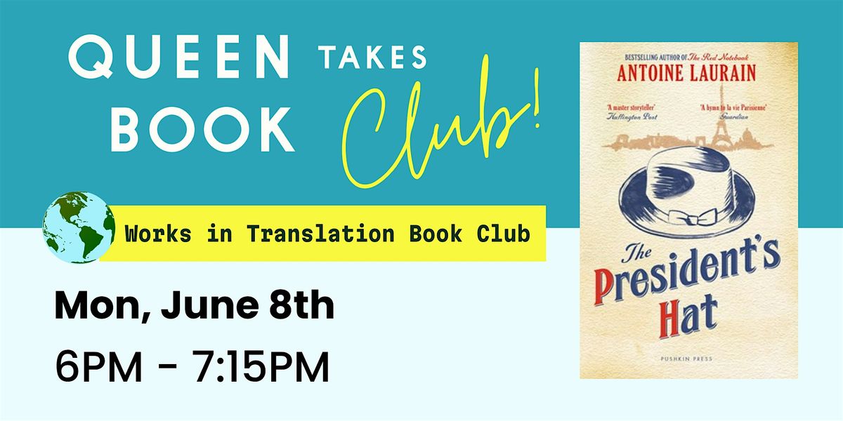 Join us for our first Works in Translation Club meeting on Monday, June 8th at 6pm. We'll be reading "The President's Hat" Antoine Laurain (translated from French by Louise Rogers Lalaurie, Jane Aitken, and Emily Boyce).