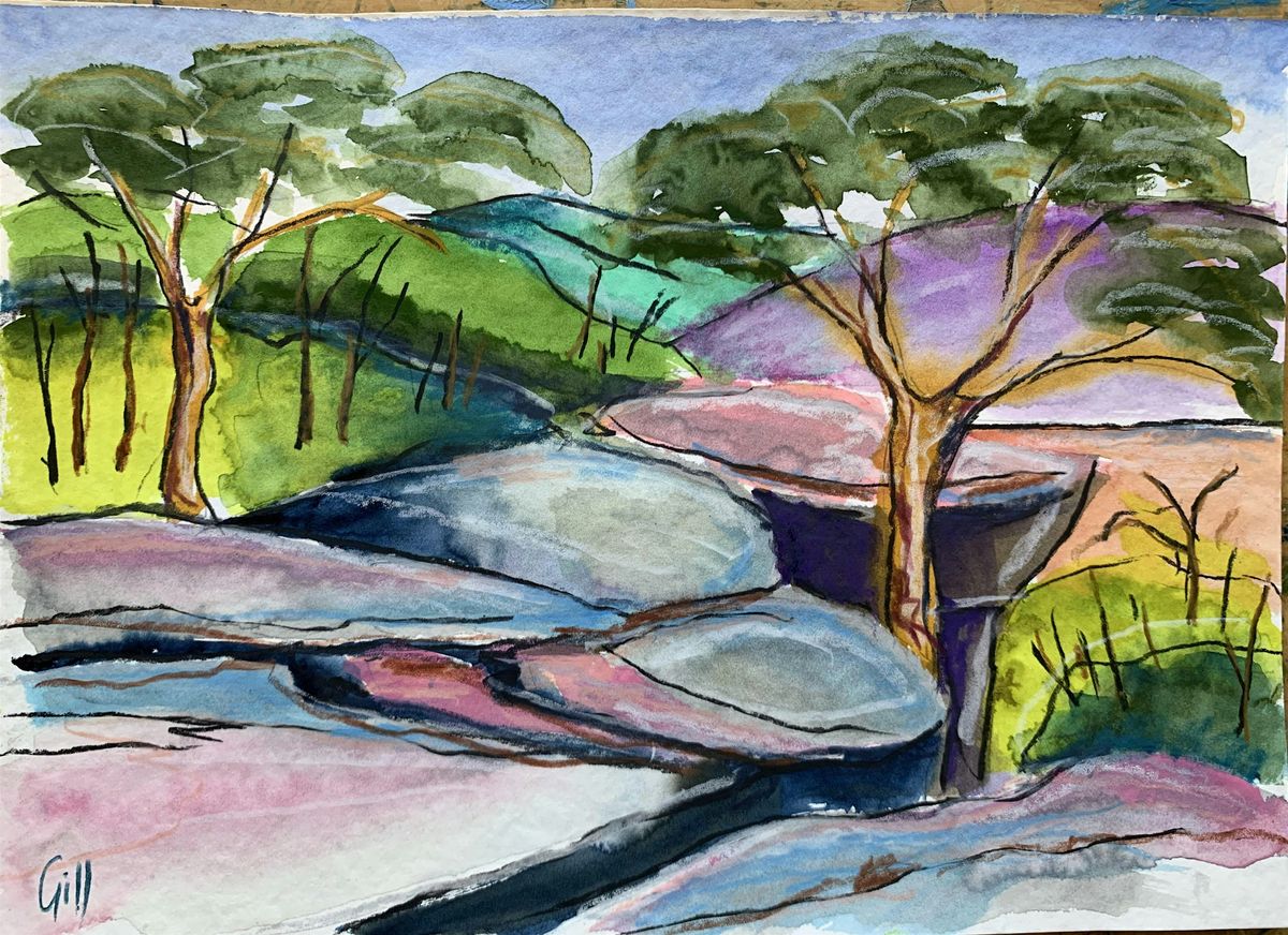 Work with HOME: A place we call artist Carol Gill to learn the basics of colour field sketching. Using watercolour and charcoal pencils, explore Carol's unique, modern style of landscape painting.