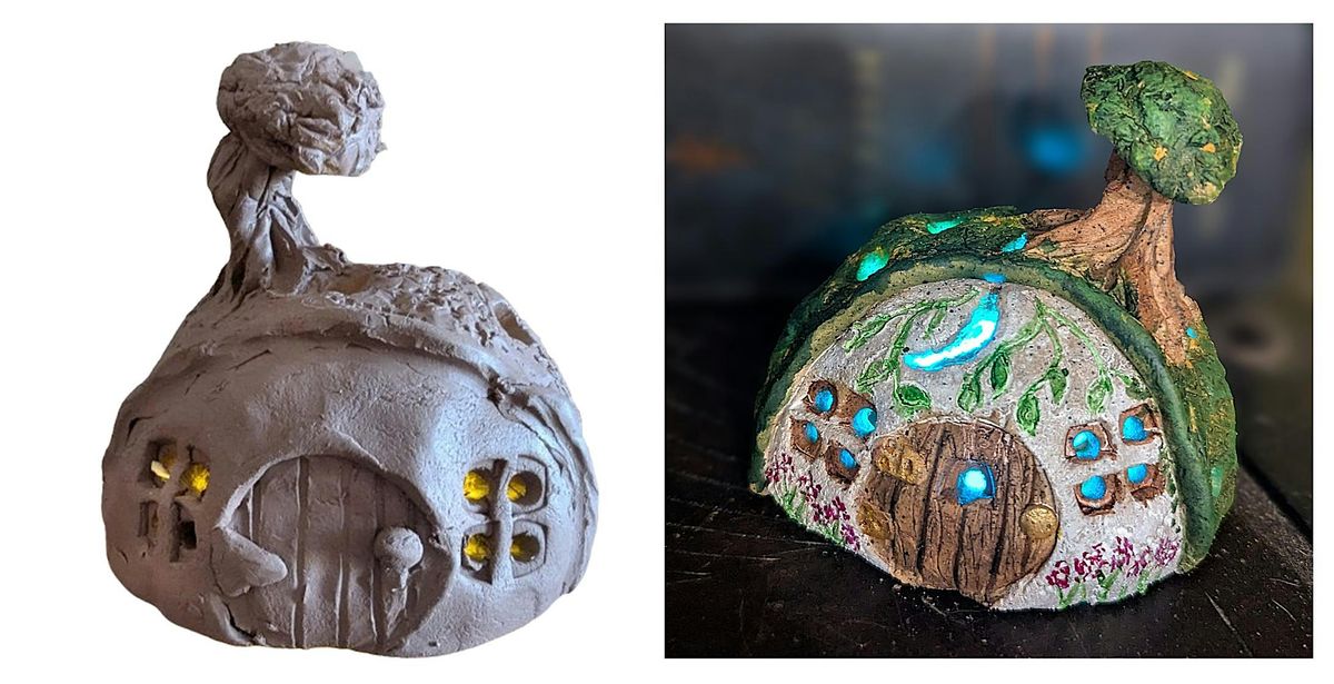 No experience needed-just bring your creativity. You’ll be guided step-by-step through forming the house adding a tree, window, doors, and textures, and giving your Hobbit house its own style. By the end of the class, you’ll have a one-of-a-kind sculpture. You will be painting the project at home when is completely dry. Instuctor will give painting options and a demo and give you a photo to take home for reference.