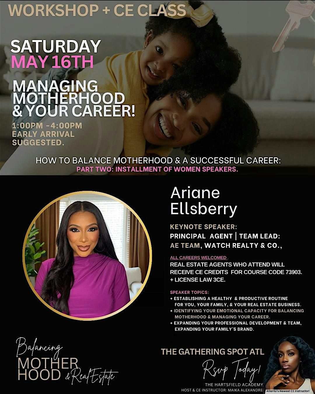 You are invited to join us for our unique event: "Managing Motherhood & Careers" as part of our "Balancing Motherhood & Real Estate - panlist & curated event. Non-Real Estate careers invited & all careers are welcomed. | REAL ESTATE AGENTS IN ATTENDANCE CAN RECEIVE CE CREDITS which will include: license law & course code 73903 (6CE; two classes taught simultaneously) with approved GREC school: THE HARTSFIELD ACADEMY.