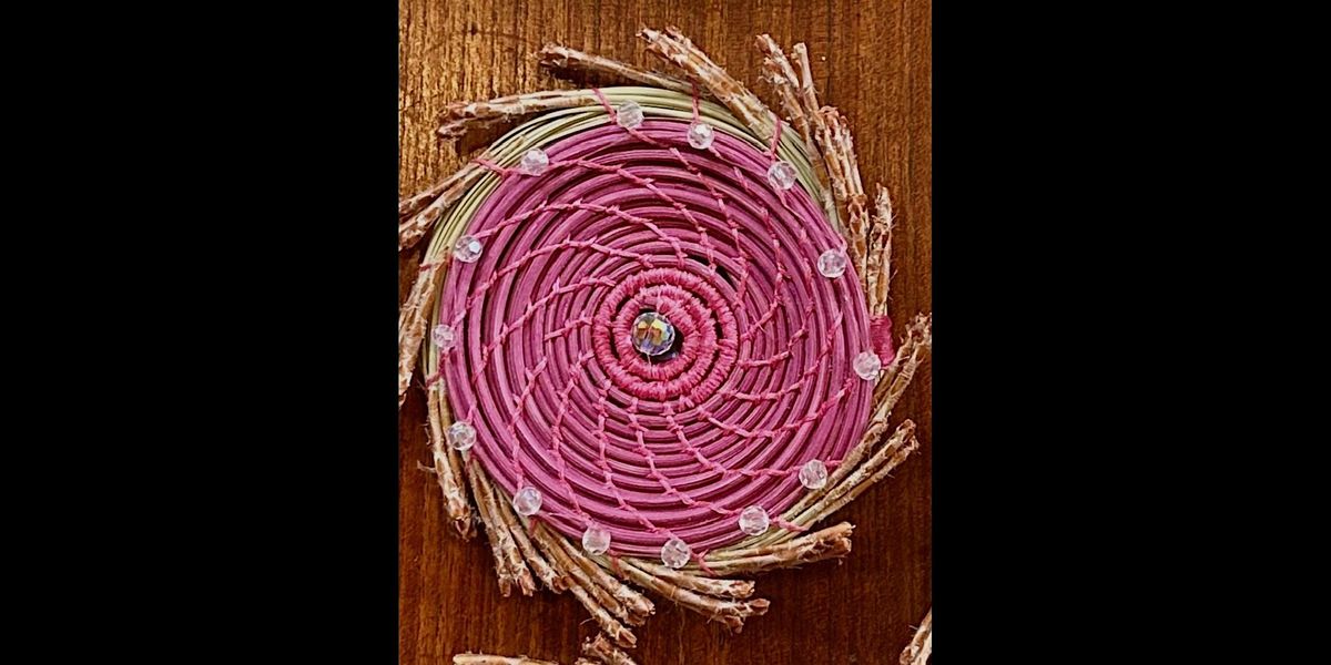 Weaving Light — The Story Wheel Prism. In this hands-on workshop students create a circular Story Wheel light catcher using reed and a simple coiling technique. Beginning from the center, participants wrap and stitch reed as the form spirals outward into a sculptural circle. Glass beads accent the outer edge, a pine needle fringe creates natural texture around the rim, and a large faceted crystal prism is suspended in the center—transforming the piece into a radiant light catcher that scatters light when hung in a window.