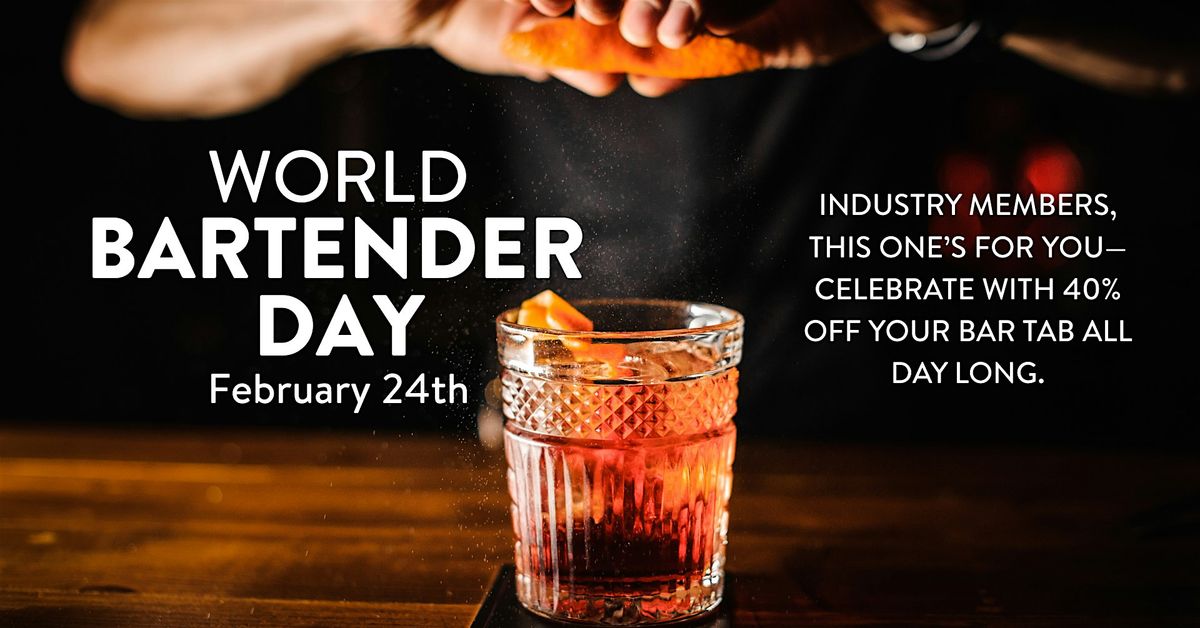 On World Bartender Day, all hospitality and industry professionals receive 40% off their bar tab as a thank-you for everything you do.About this Event
