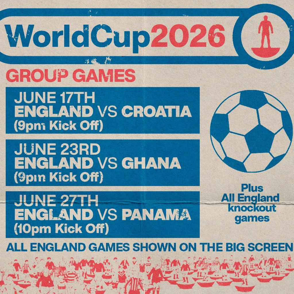 Showing all England games on the big screen: ticket includes beer/wine/soft drink, hot dog & fries! Guaranteed a seat.