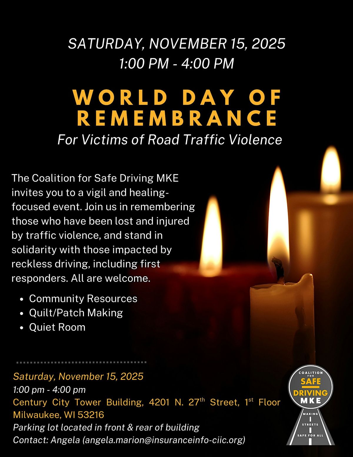 The Coalition for Safe Driving MKE invites you to a vigil and healing-focused event. Join us in remembering those who have been lost and injured by traffic violence, and stand in solidarity with those impacted by reckless driving, including first responders. All are welcome. We will also feature breakout rooms, resources and food: