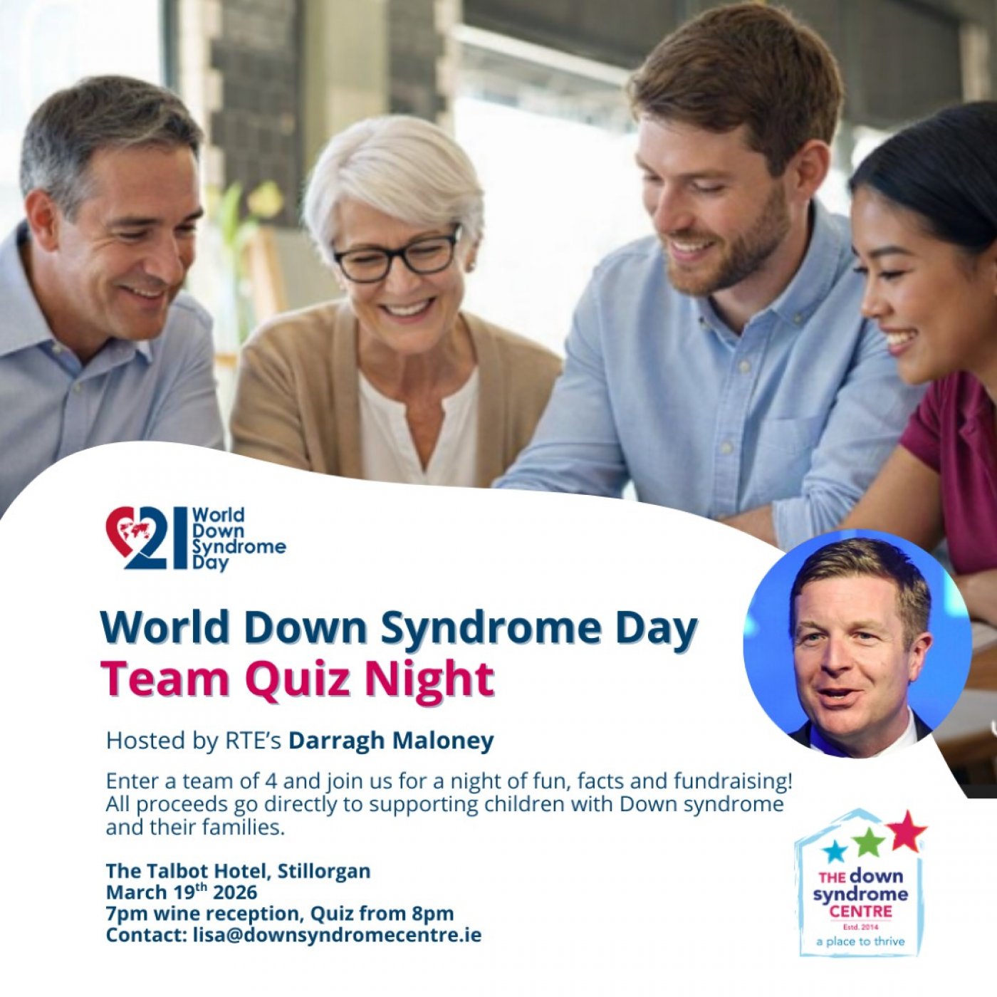 The Down Syndrome Centre is hosting its annual Quiz Night on Thursday, 19 March 2026, at the Talbot Hotel, Stillorgan, marking World Down Syndrome Day.